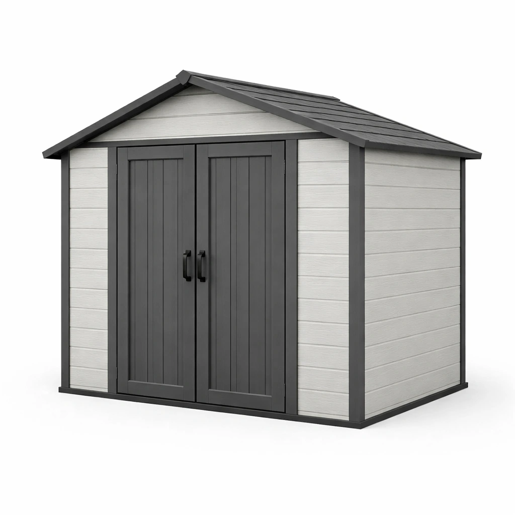 Esta caseta de jardín está fabricada en polietileno resistente a la intemperie. Diseñada para exteriores, ofrece un diseño funcional.