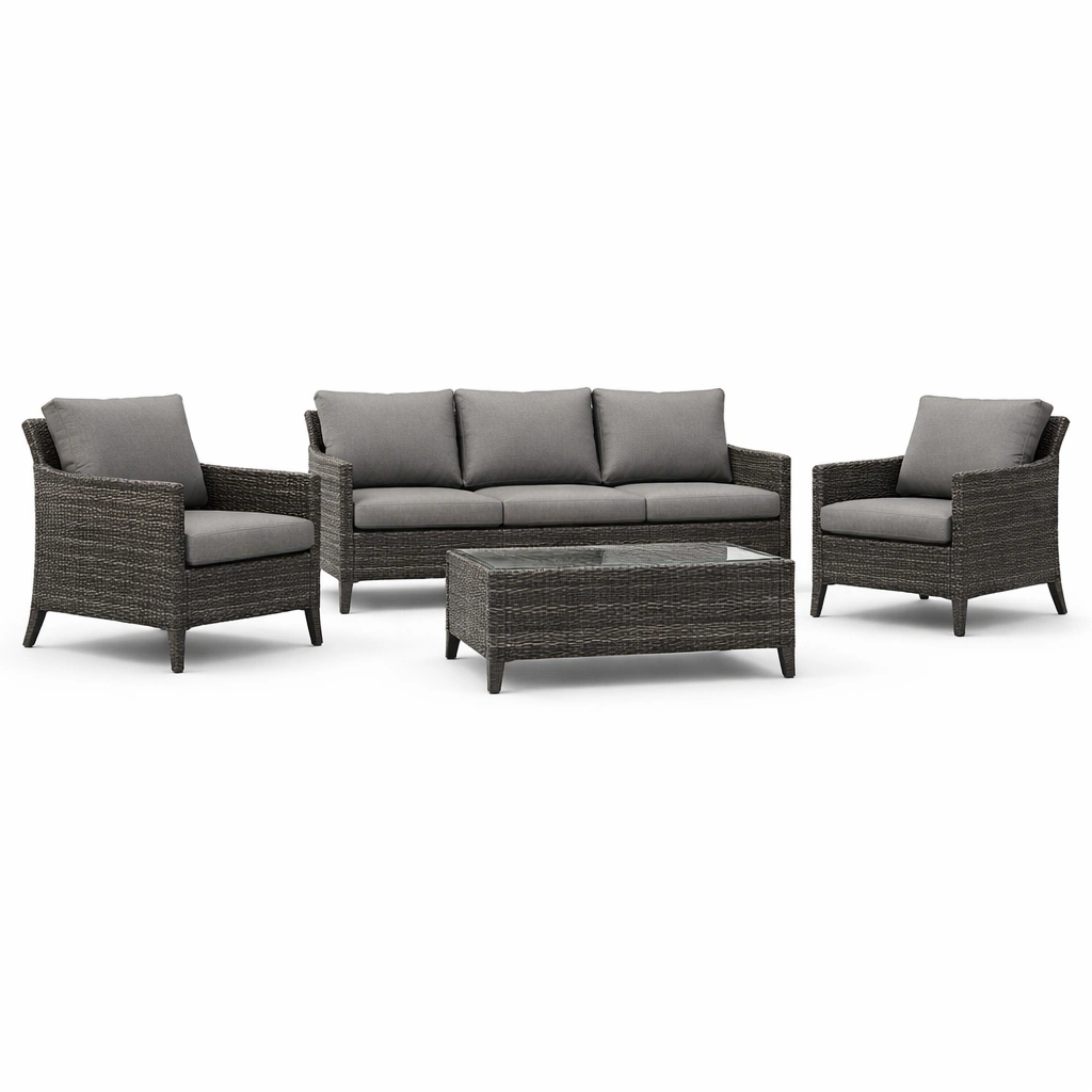 Materiales: Estructura de aluminio con revestimiento de ratán sintético, cojines de tela de poliéster, sobre de vidrio templado de 5 mm.